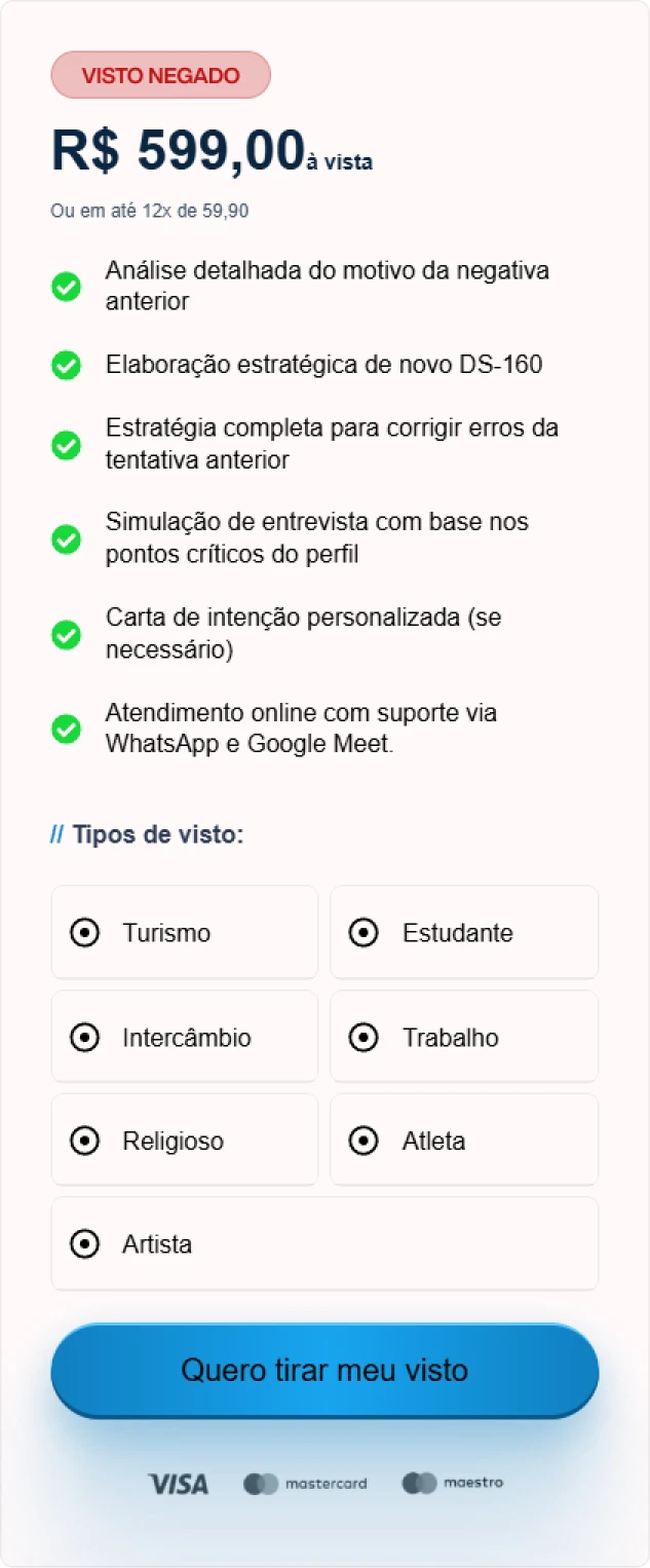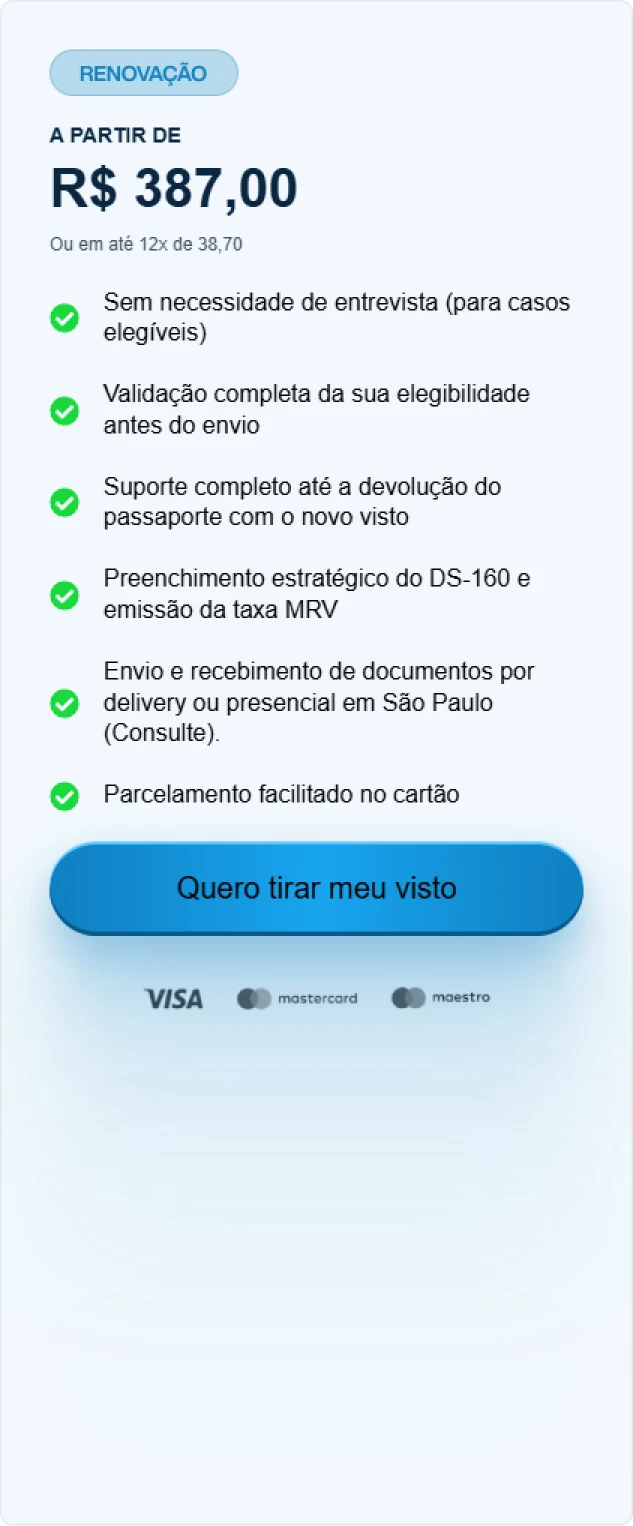 Cuidamos de toda a burocracia do formulário DS-160 (em inglês), garantindo que as informações batam com a realidade.