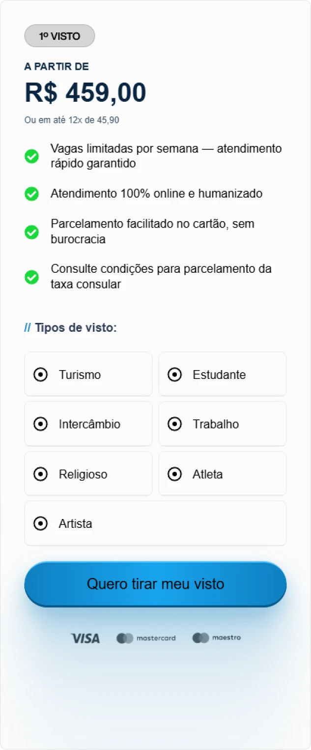 Não deixe a burocracia cancelar sua viagem. Não coloque seu planejamento em risco por detalhes burocráticos. Tenha o acompanhamento de especialistas que cuidam de tudo: da análise minuciosa do formulário ao treinamento exclusivo para sua entrevista.